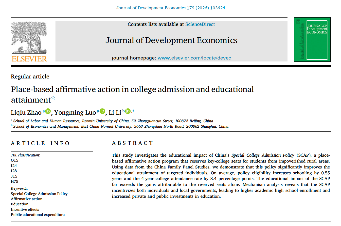 Liqiu Zhao, Yongming Luo, and Li Li. 2026. “Place-based affirmative action in college admission and educational attainment.”Journal of Development Economics, 179, 103624.